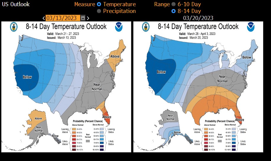 O clima nos Estados Unidos permanece mais quente, o que deverá permitir um maior aumento das reservas de gás natural nos EUA em comparação com a média de 5 anos e acima dos níveis do ano passado. Fonte: Bloomberg