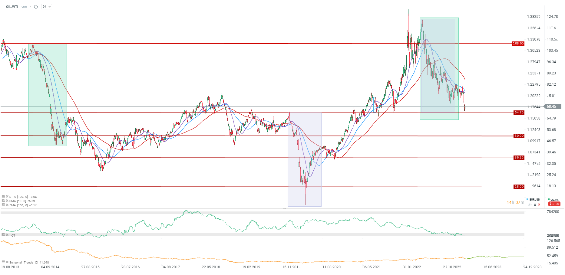 O preço do petróleo está a ser negociado perto de um suporte importante. Os dados do CFTC apontam para um forte excesso de venda de petróleo, mas estes dados provêm do início de Março e, por conseguinte, estão atrasados. Os padrões sazonais sugerem que a baixa local está próxima. Fonte: xStation5