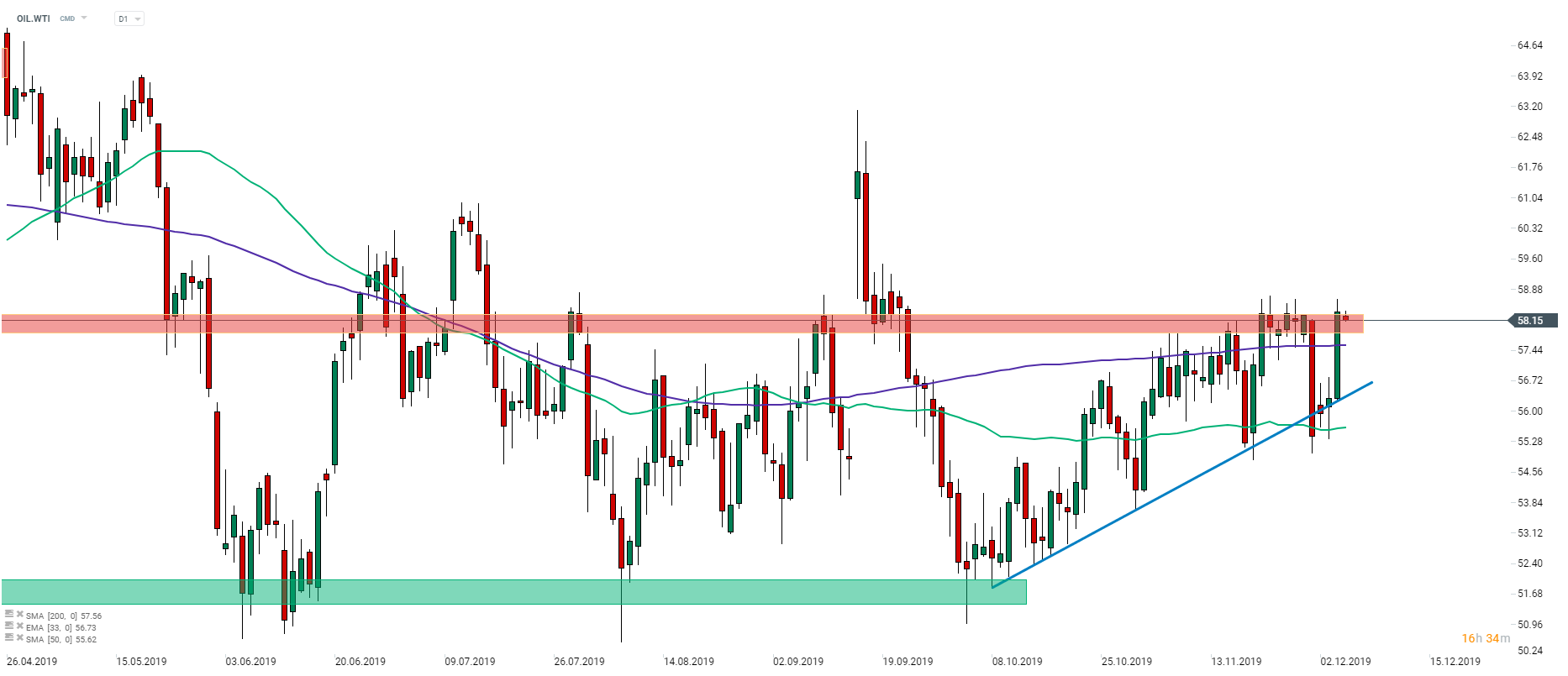 O WTI (OIL.WTI) subiu ontem, com o relatório do DOE a mostrar uma queda nos stocks maior do que o esperado e com alguns membros da OPEP a sugerir cortes mais profundos na produção. O preço do petróleo atingiu a zona de resistência que varia em torno de US $ 58. Os traders devem seguir o fluxo de notícias de hoje com cuidado, pois os membros da OPEP estão reunidos em Viena. Fonte: xStation5