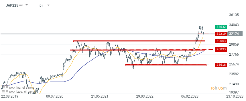 O rally no índice japonês Nikkei 225 abrandou recentemente. O índice formou um topo duplo acima da marca dos 33.600 pontos e está atualmente a testar a zona de suuporte junto da marca dos 32.200 pontos.