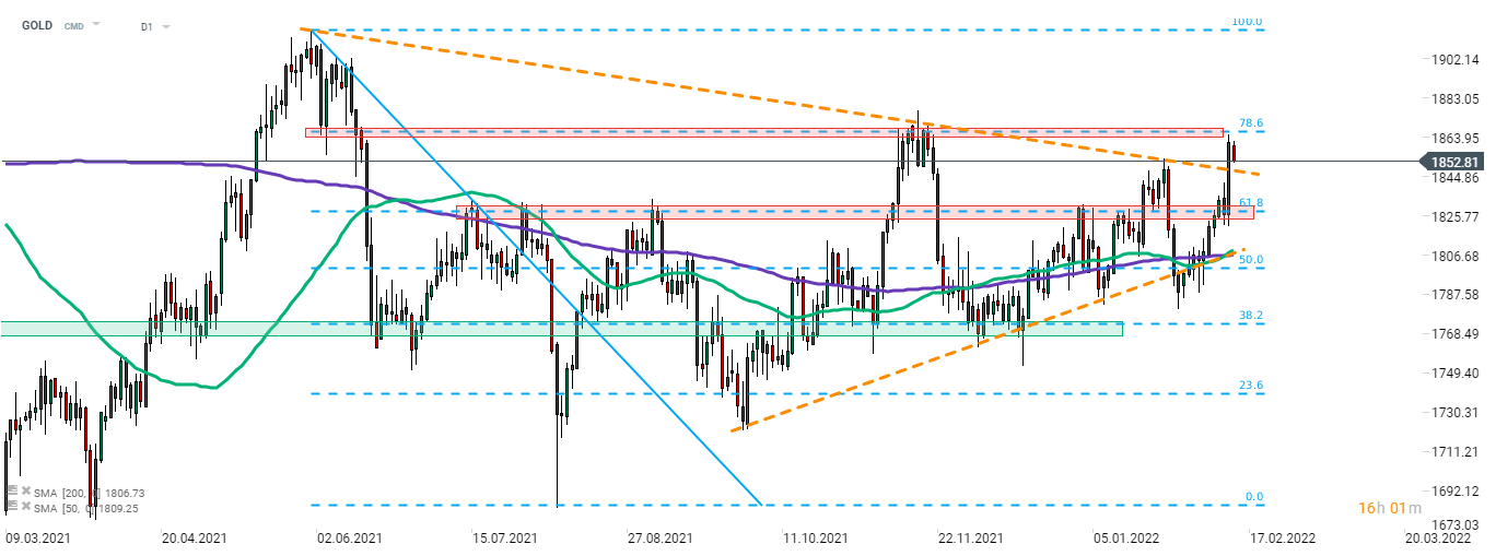 O ouro reagiu em alta na sessão de sexta-feira depois de terem surgido novas notícias spbre a invasão russa na Ucrânia. O metal precioso ultrapassou acima do limite superior do padrão gráfico. Contudo, o movimento de alta foi interrompido mais tarde perto da zona de resistência marcada pelos nívies de Fibonacci nos 78,6% (área de 1.865 dólares). Fonte: xStation5