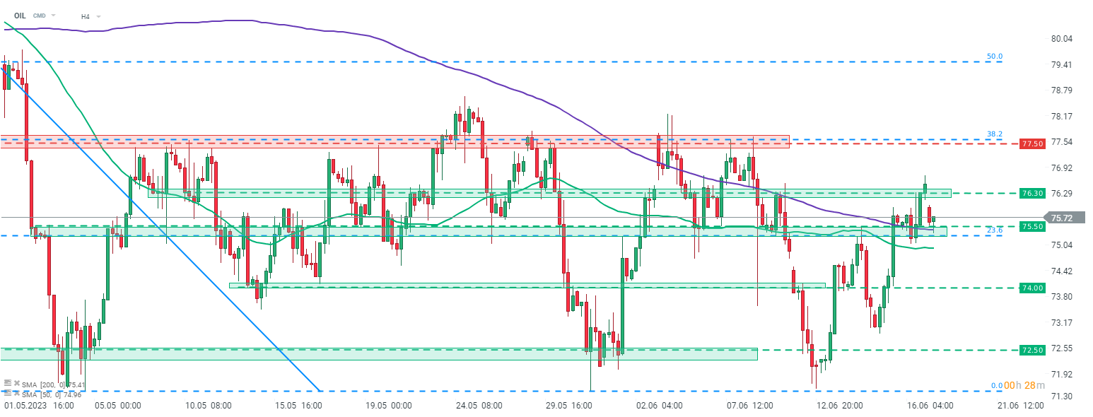 O Brent (OIL) começou a sessão em baixa, com notícias sobre o aumento das exportações iranianas, bem como cortes nas previsões de crescimento chinês, criando uma pressão descendente sobre os preços. O petróleo testou a média móvel de 200 períodos no intervalo H4 esta manhã (linha roxa), mas os compradores acabaram por recuperar o controlo do preço. Fonte: xStation5