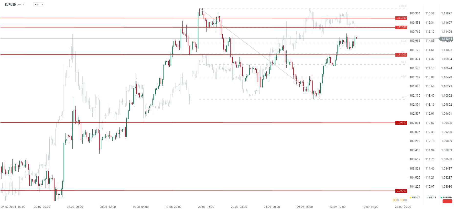 Parece que um corte de 25 pontos base deverá fortalecer significativamente o dólar, que tem estado claramente enfraquecido nos últimos tempos. Naturalmente, as previsões económicas e as perspectivas de novos cortes este ano e nos próximos anos também serão importantes. Um corte de 50 pontos de base, mas sem cortes maiores no futuro, também poderia melhorar a situação do dólar. Um corte de 50 pontos base e a comunicação de novos cortes fortes podem levar a um aumento do EURUSD a médio prazo para 1,12-1,13.