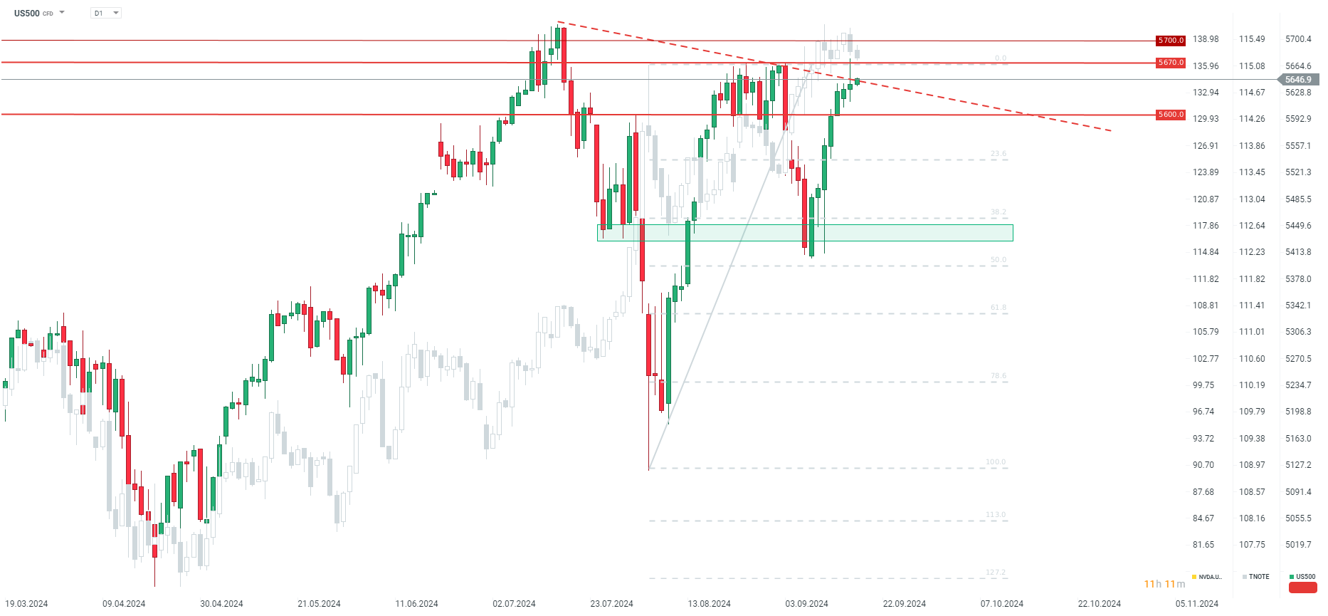 Embora um corte de 50 pontos base possa sinalizar previsões económicas fracas, parece que, neste momento, um corte menor seria dececionante para o mercado. Mesmo previsões muito otimistas não seriam capazes de levar a uma continuação dos ganhos recentes. Se tivermos um corte de 25 pontos base, o US500 poderá testar a área dos 5600 pontos. Por outro lado, um corte de 50 pontos base, sem previsões muito negativas mas com a promessa de mais cortes fortes, deverá levar a um teste de pelo menos 5670 e a um aumento nas sessões seguintes para 5700.