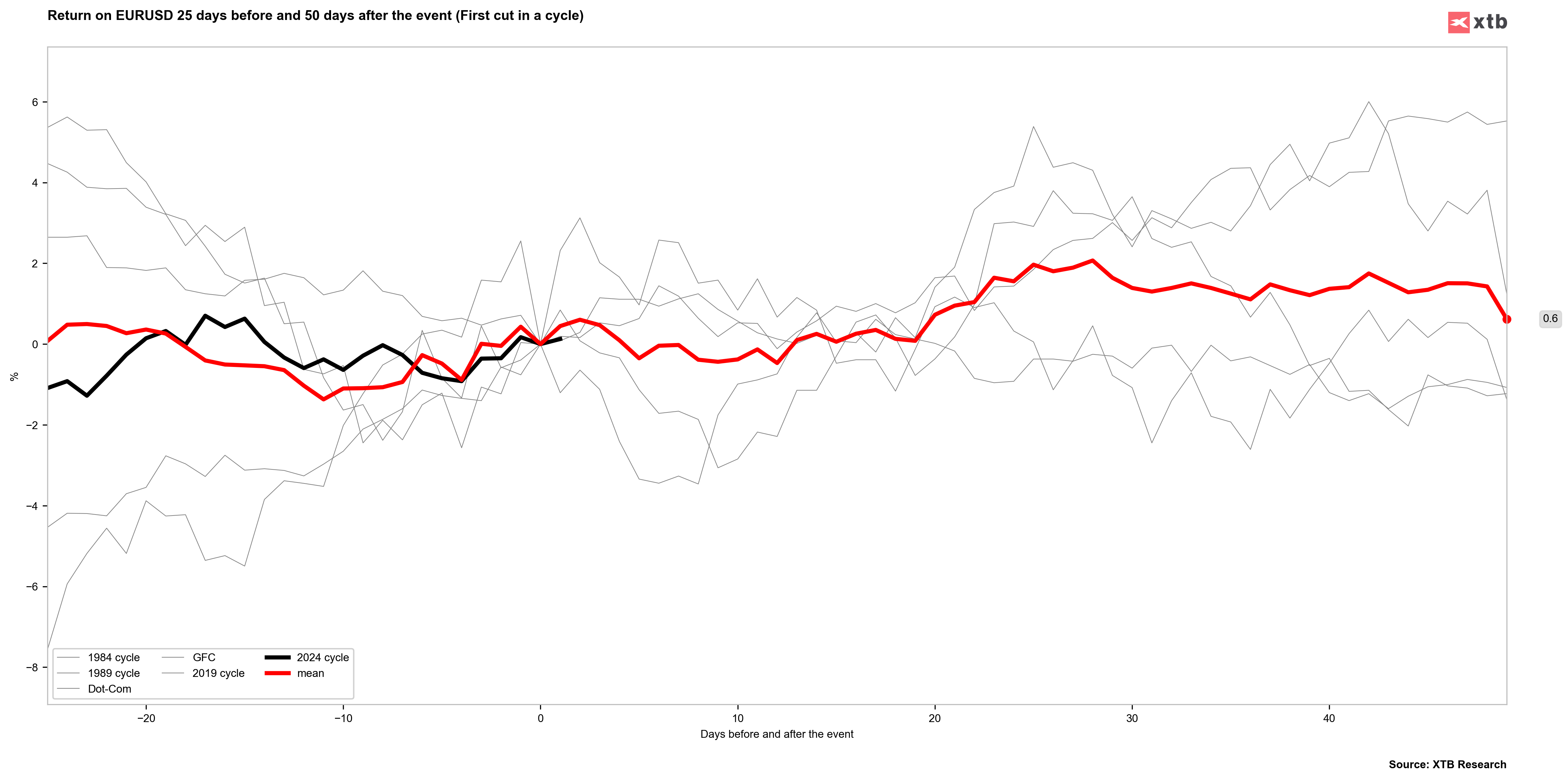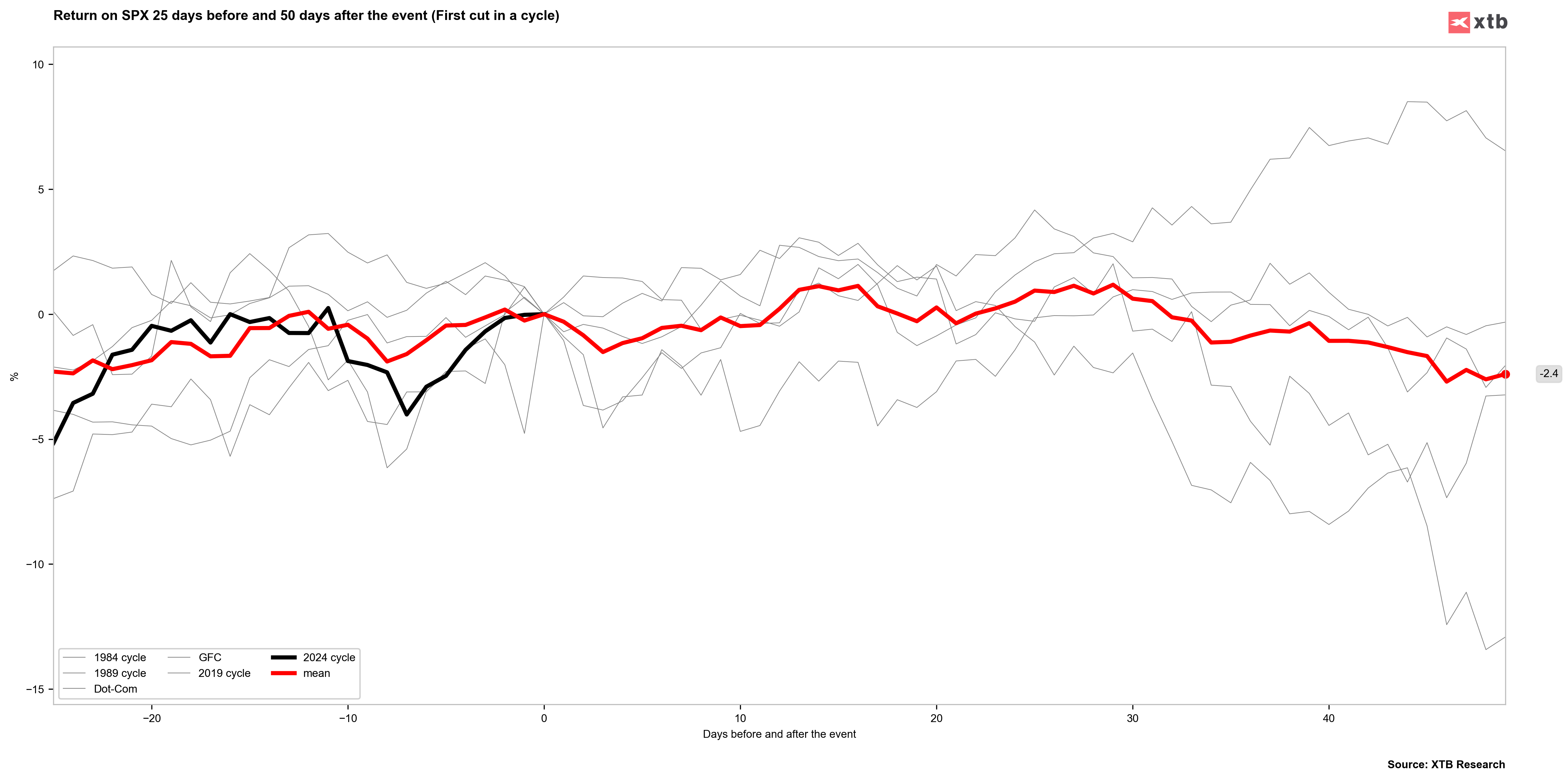 Olhando para o comportamento do S&P500 após o primeiro corte do ciclo, normalmente tivemos uma tomada de lucros nos primeiros dias após os ganhos anteriores. Como pode ver, o S&P 500 ganhou normalmente cerca de 9-10 sessões antes da decisão. No entanto, no espaço de 10 a 20 sessões, o S&P 500 estava normalmente próximo dos níveis anteriores à decisão. Fonte: Bloomberg Finance LP, XTB