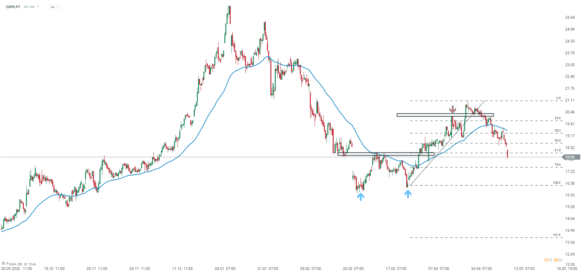 EDP Renováveis (EDPR.PT), gráfico 4 horas. Fonte: xStation 5