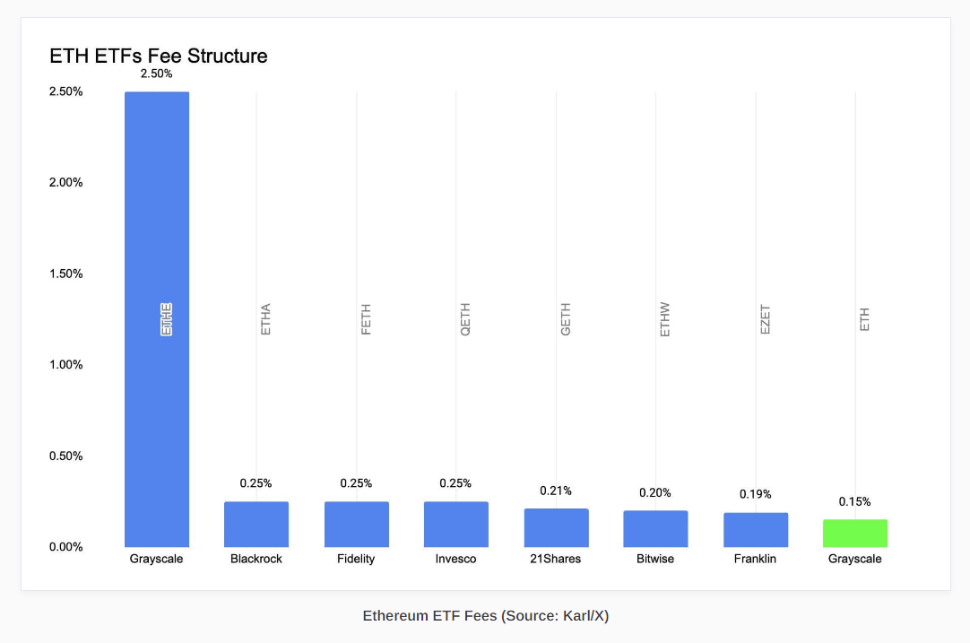 Esperava-se que, como no caso da Bitcoin, houvesse uma forte saída de fundos da Grayscale. No entanto, a Grayscale reduziu significativamente as comissões do seu fundo Ethereum Mini Trust. A empresa oferece atualmente os ETF Ethereum mais baratos e mais caros. Especula-se também que a conversão será isenta de impostos, o que poderia reduzir ainda mais qualquer potencial liquidação.