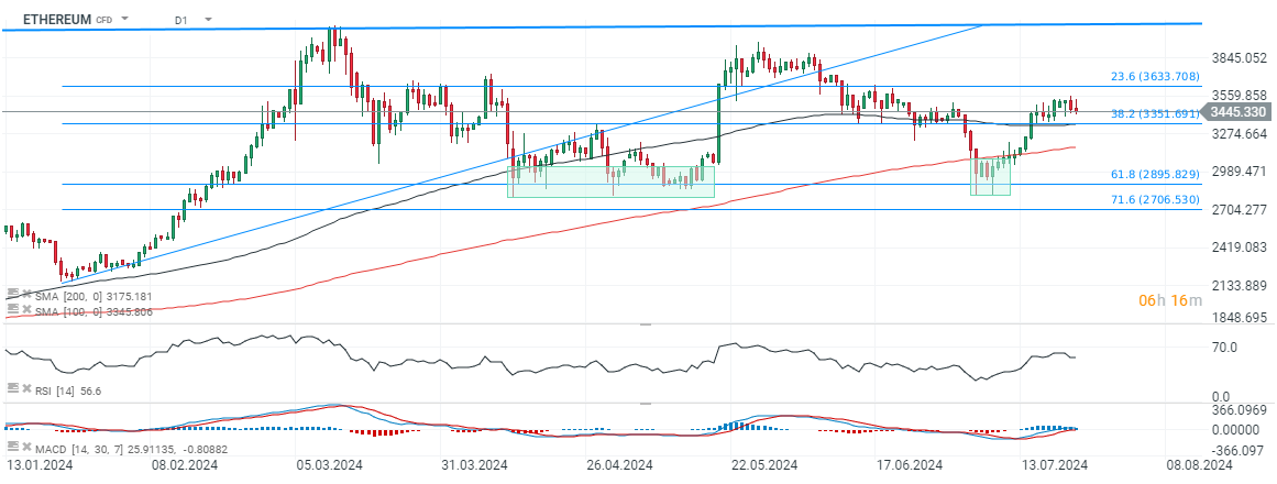 ETHE.US e o preço do Ethereum. Na parte inferior, o volume, que inicialmente não se afastava da média, mas agora é significativamente maior. Fonte: Bloomberg FInance LP, XTB
