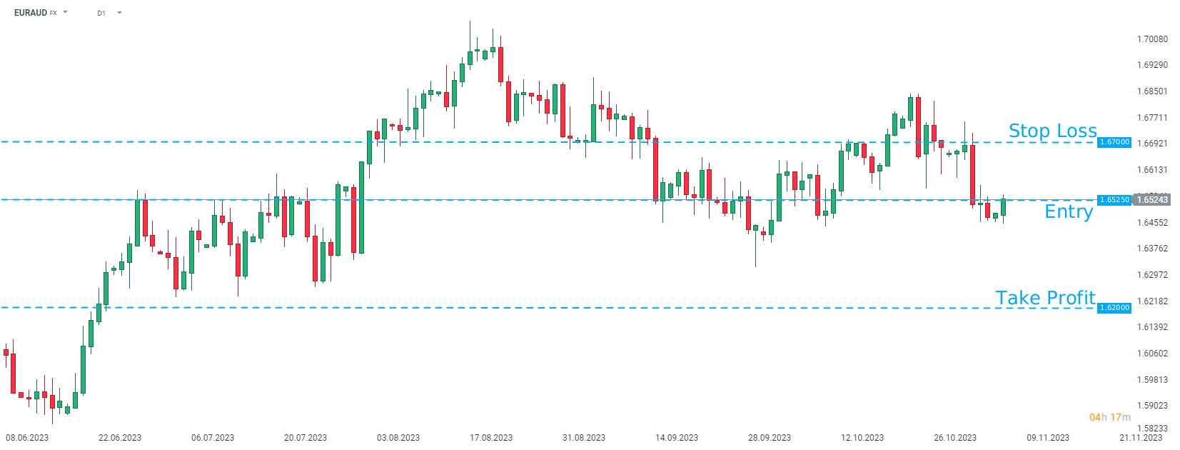 Goldman Sachs recomenda colocar uma posição curta sobre EURAUD a preço de mercado com um objetivo de 1.6200 e uma ordem de stop loss colocada em 1.6700. Fonte: xStation5