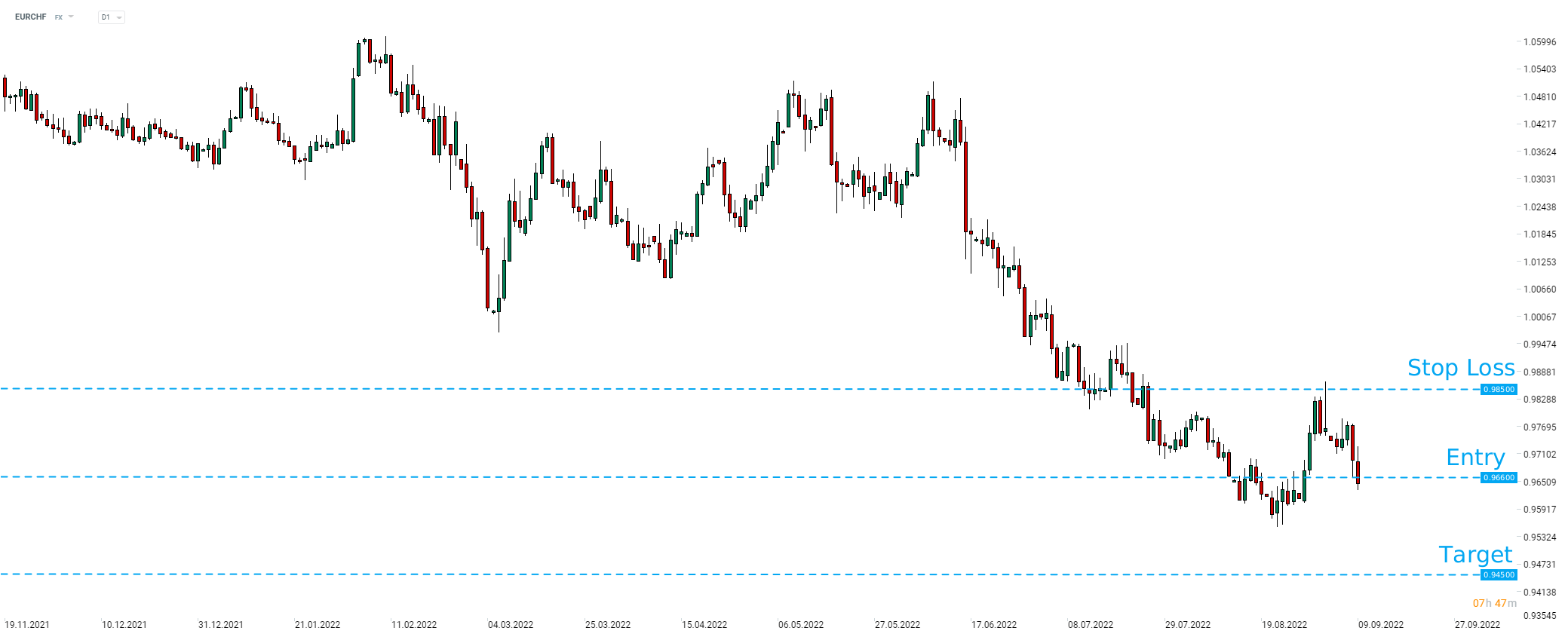 O Goldman Sachs recomenda entradas curtas no par EURCHF ao preço de mercado com target nos 0.9450 e stop loss colocado nos 0.9850. Fonte: xStation5