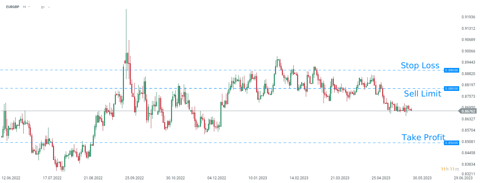 ANZ recomenda colocar uma ordem pendente (posição curta) em EURGBP com uma ordem de limite em 0,8800. O banco recomenda 0.8500 como TP e 0.8900 como o SL. Fonte: xStation5