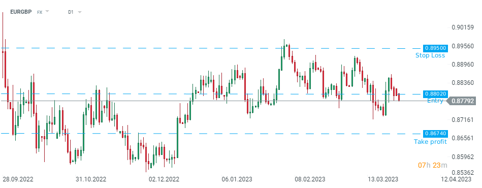 Credit Agricole recomenda tomar uma posição curta no EURGBP a 0,8802 com um objectivo de 0,8674 e uma ordem de stop loss colocada nos 0,8950. Fonte: xStation5