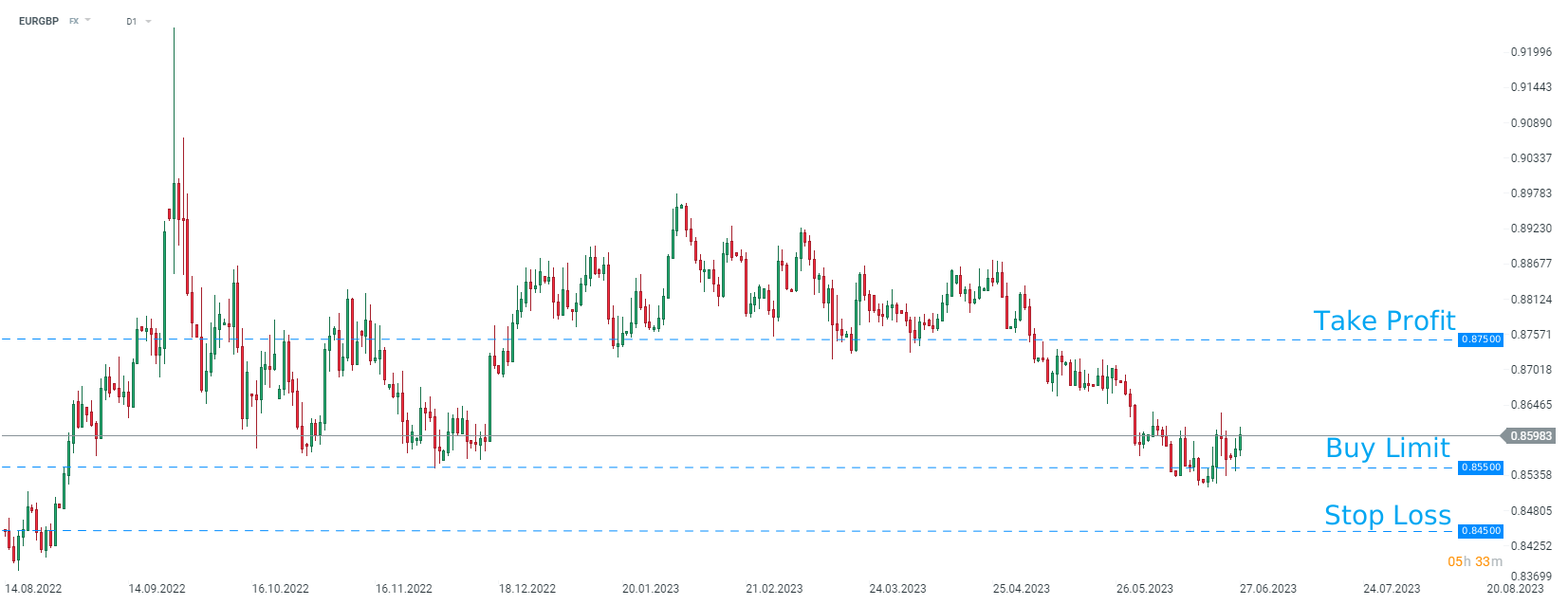 O HSBC recomendacolocar uma posição longa e pendente no EURGBP com uma ordem de limite em 0,8550, um TP de 0,8750 e uma ordem de stop loss colocada em 0,8450. Fonte: xStation5