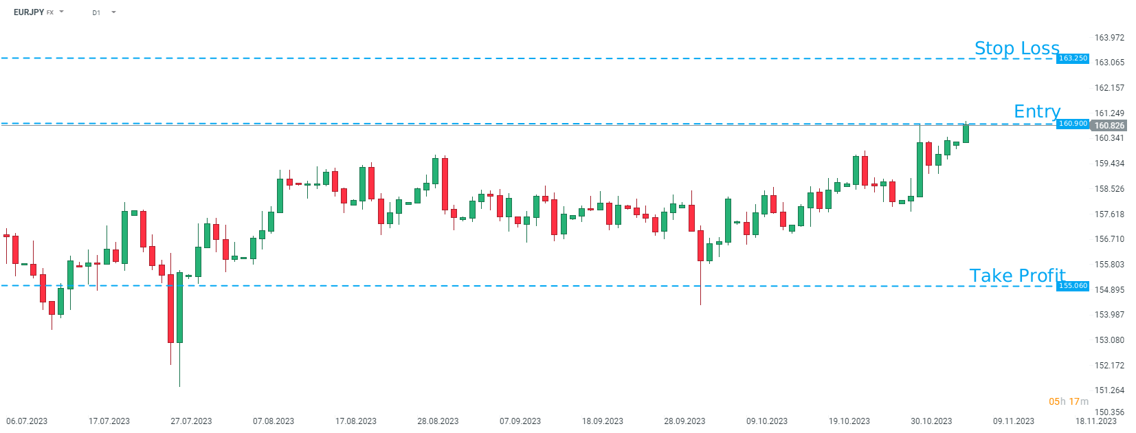 Credit Agricole recomenda colocar uma posição curta no EURJPY a preço de mercado com um objetivo de 155,06 e uma ordem de stop loss colocada em 163,25. Fonte: xStation5