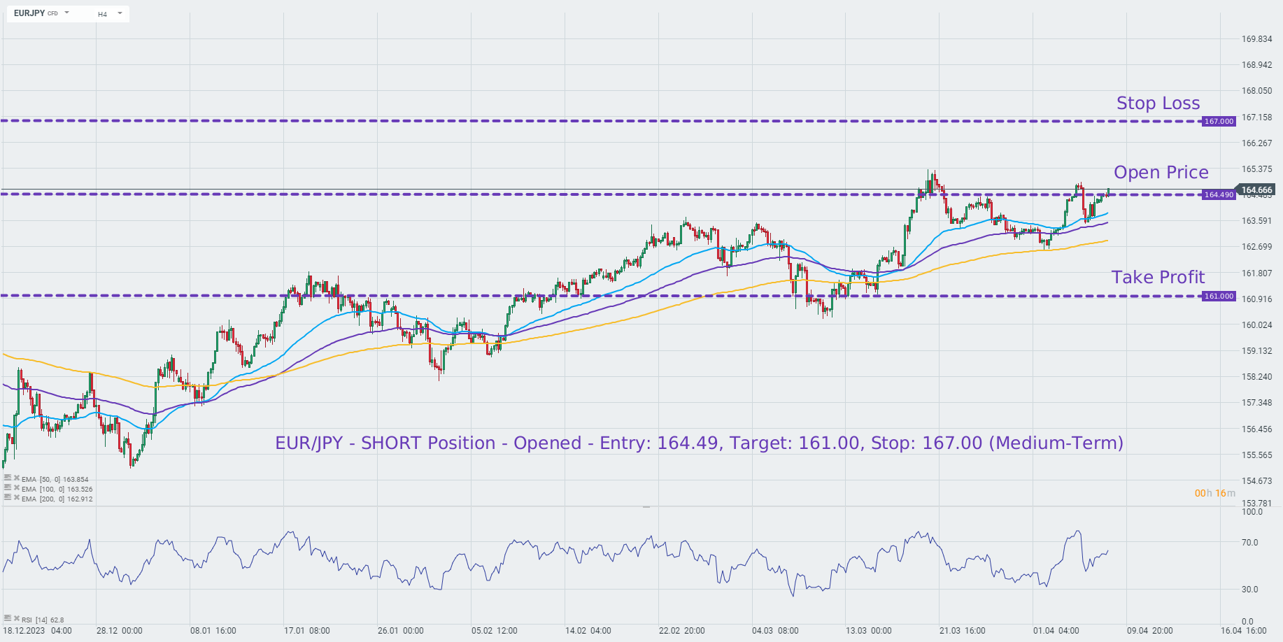 O Credit Agricole recomenda colocar uma posição curta no EURJPY ao preço de mercado com um objetivo de 161,00 e uma ordem de paragem de perda em 167,00. Fonte: xStation5