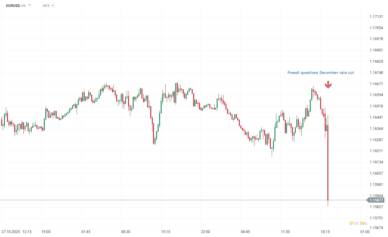Depois de Powell ter lançado dúvidas sobre um corte das taxas em dezembro, os mercados tornaram-se mais cautelosos. Os índices de ações registaram quedas entre 0,50% e 1,00%, enquanto o dólar se fortaleceu acentuadamente. O par EURUSD caiu 0,50%, recuando para abaixo do nível de 1,1600.