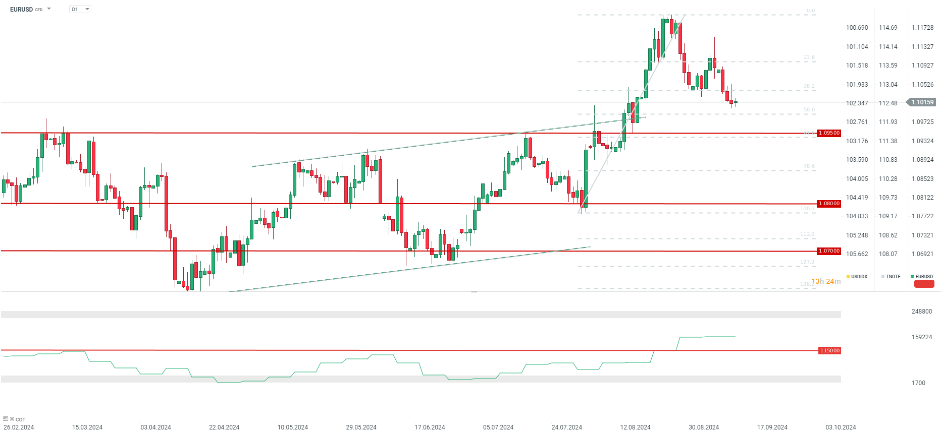 O primeiro cenário para o EUR/USD, poderá passar pelo rompimento da zona de suporte marcada pelos 1,10 em direção à zona dos 1,0950, no caso de Lagarde adotar um discurso mais hawkish. Por outro lado, parece que o euro continua a dar sinais de recuperação, e o par pode testar o nível de 1,1050, apoiado também pela expetativa de corte da taxa da Reserva Federal e melhores sentimentos dos mercados globais após a sessão de ontem em Wall Street.