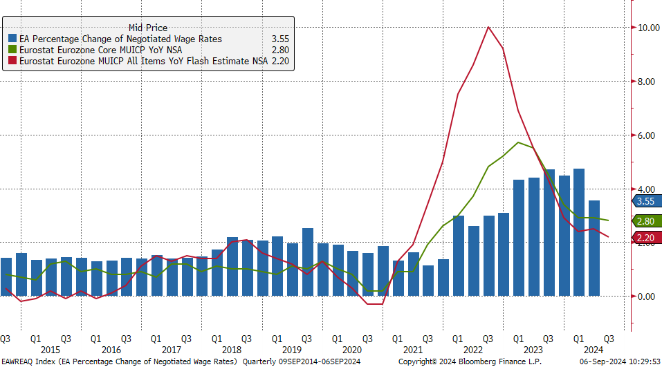 A inflação na zona euro caiu para 2,2% em agosto. A inflação subjacente mantém-se ligeiramente elevada, em 2,8%. O crescimento dos salários negociados caiu de forma bastante notória, o que é um indicador importante na perspetiva do BCE. Por outro lado, o BCE continua a ter problemas com a inflação no sector dos serviços, que se mantém estável acima dos 4%. Fonte: Bloomberg Finance LP, XTB