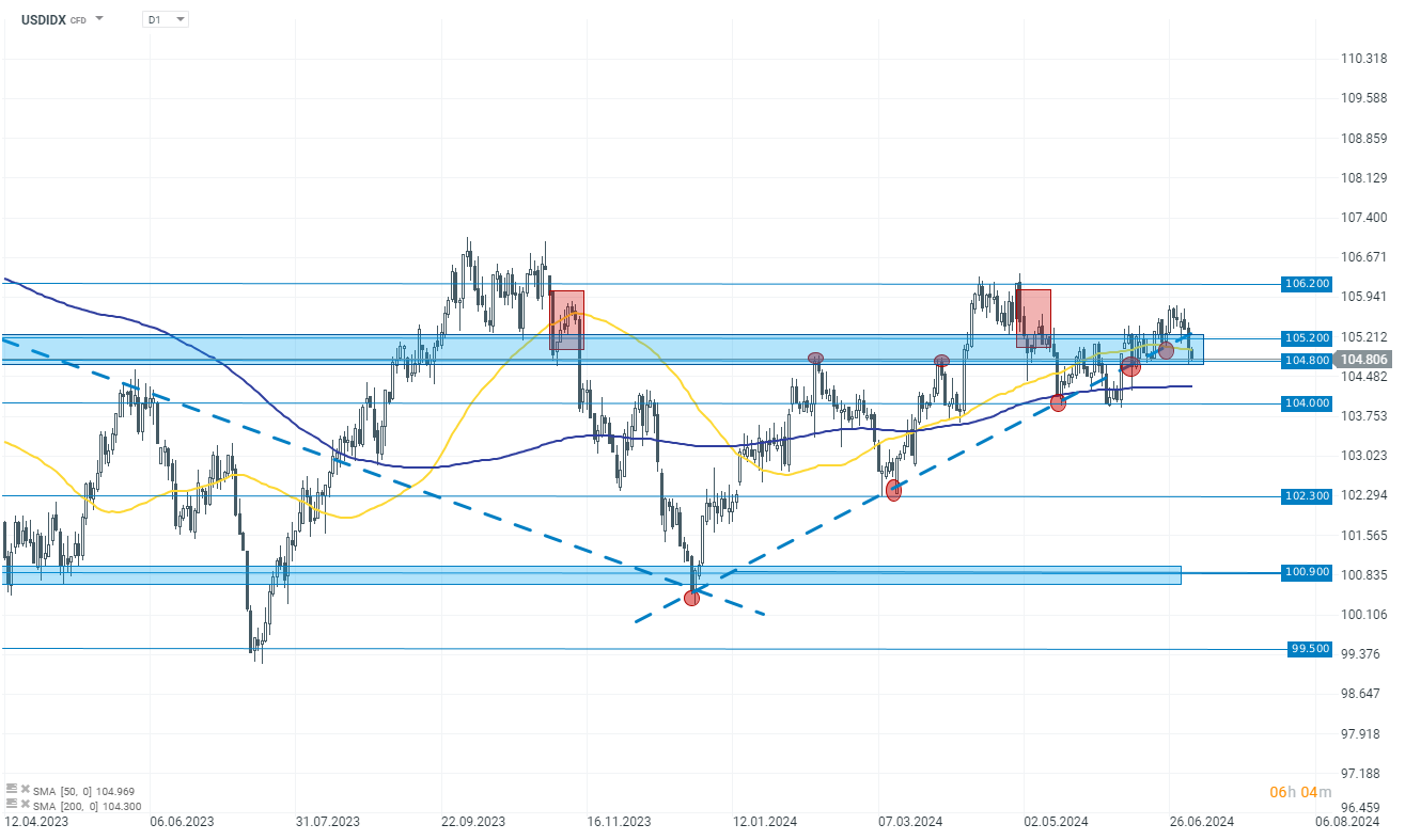 O índice do dólar está a cair 0,23% hoje, quebrando abaixo de uma zona de suporte chave (linha de tendência ascendente tracejada). Muito depende do relatório de emprego NFP de amanhã. Se os dados forem igualmente fracos, podemos esperar mais vendas do dólar devido a preocupações sobre uma economia americana em desaceleração. Não há muito tempo, assistimos à reação oposta, em que os mercados reagiram positivamente a dados mais fracos, antecipando cortes mais rápidos das taxas de juro. Atualmente, vemos que a abordagem dos investidores está a mudar lentamente. Se a pressão descendente sobre o USDIDX persistir, a próxima zona de suporte está no nível 104.000.