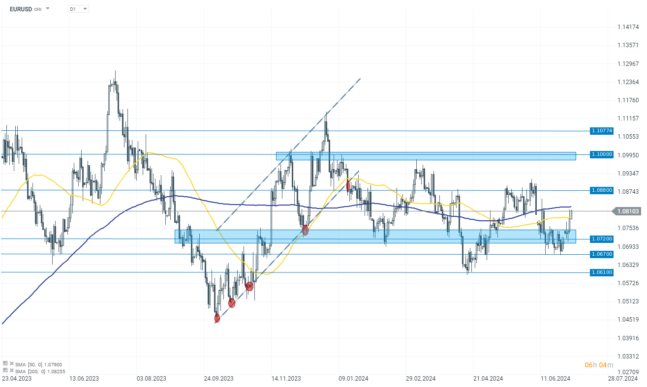 EURUSD está a subir 0,27% a partir do nível 1,0810, saindo de uma zona de suporte chave. As duas últimas sessões dinâmicas de alta indicam um forte impulso. O próximo alvo para o movimento atual pode ser o nível 1.0880. Por outro lado, o nível de suporte mais próximo é a recente zona de consolidação em torno de 1.0700.