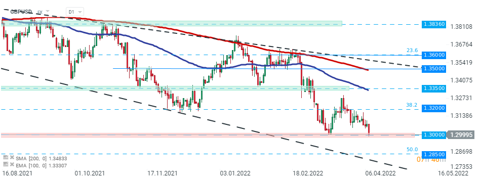 O par GBPUSD caiu fortemente nas últimas semanas, acabando por sair prejudicado com as políticas monetárias conduzidas pela FED e pelo Banco de Inglaterra (BoE). O BoE começou a ter uma postura menos hawkish durante a reunião de Março, o que pode sugerir que os decisores políticos britânicos podem estar mais preocupados com as perspectivas de crescimento do que com uma inflação elevada. Entretanto, espera-se que o FED se torne mais hawkish este ano e muitos investidores esperam uma subida de 50 pts base em Maio, o que apoia o dólar americano.
