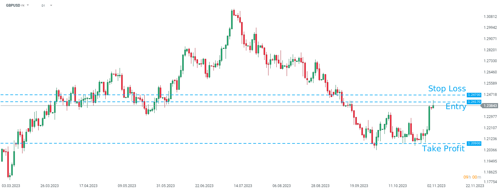 IFR recomenda colocar uma posição curta sobre GBPUSD a preço de mercado com um objetivo de 1,2090 e uma ordem de stop loss colocada em 1,2470. Fonte: xStation5