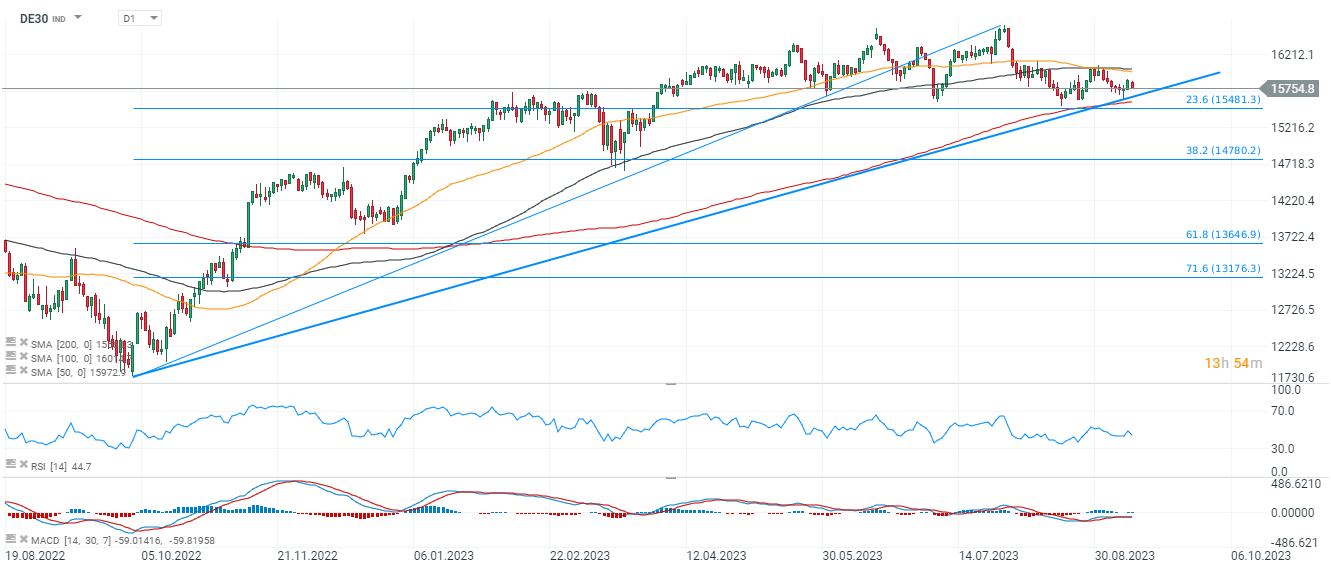 Do ponto de vista técnico, o DAX (DE30) continua a ser negociado acima da média SMA200 (linha vermelha), dos níveis de Fibonacci nos 23,6%. No entanto, se os vendedores conseguirem ultrapassar abaixo da marca dos 15.000 pontos, o movimento de baixa deverá intensificar-se muito mais.