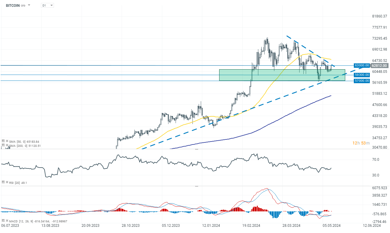 O Bitcoin tem estado em uma ampla faixa de consolidação por mais de dois meses e, desde a redução pela metade há 21 dias, a capitalização de mercado do Bitcoin caiu 5,50%. O sentimento mais fraco em relação às criptomoedas pode ser associado a correcções nos mercados tradicionais, onde observámos quedas de curto prazo durante praticamente todo o mês de abril. No entanto, nas últimas duas semanas, os índices do mercado de acções têm vindo a recuperar, o que também deverá apoiar os preços da Bitcoin. Nos próximos dias, o sentimento nos mercados tradicionais e de criptomoedas dependerá da publicação de dados macroeconómicos. Esta semana, na terça e quarta-feira, conheceremos os últimos dados do Índice de Preços ao Produtor (PPI) e do Índice de Preços ao Consumidor (CPI) para abril. Se os relatórios mostrarem um enfraquecimento da pressão dos preços, este poderá ser um fator de crescimento significativo para os activos de risco. No entanto, se os dados forem mais altos do que o esperado, será mais um argumento para o Fed manter as taxas de juros em um nível alto por mais tempo, pressionando simultaneamente os índices e as criptomoedas.