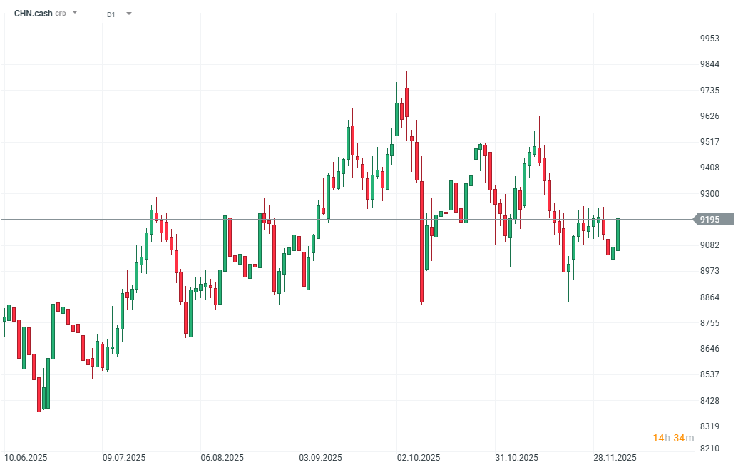 As ações chinesas tiveram uma recuperação modesta na sexta-feira, com ganhos entre 0,60% e 1,30%. O índice HSCEI em Hong Kong está a registar os ganhos mais fortes. No entanto, o panorama geral do mercado continua misto — as ações imobiliárias continuam a perder valor, enquanto as ações tecnológicas permanecem em consolidação, embora isso possa mudar após a emocionante oferta pública inicial da Moore Threads, a contraparte chinesa da Nvidia.
