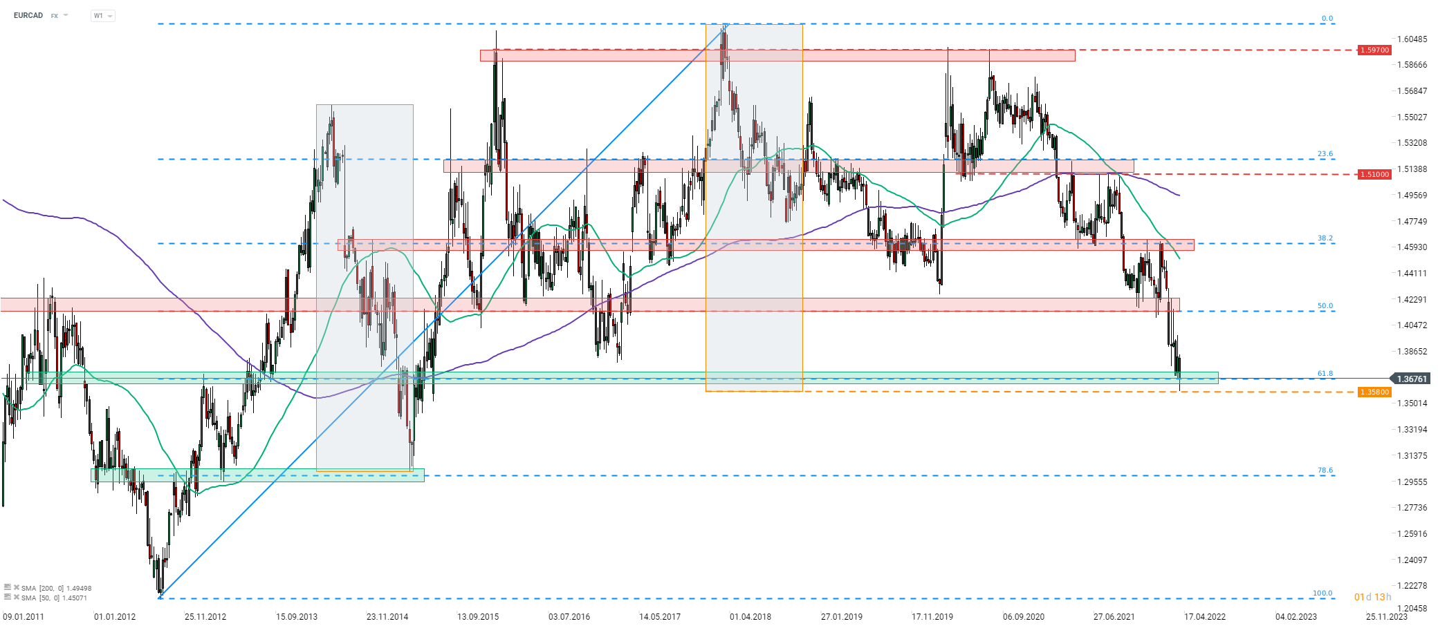 Ao analisarmos o gráfico do EURCAD através do intervalo semanal (W1), podemos ver que o par tem estado a ser negociado em baixa desde Agosto de 2020. O par caiu recentemente para mínimos de 2015.