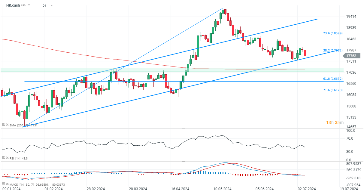 Os contratos do índice Hang Seng das empresas chinesas cotadas na Bolsa de Valores de Hong Kong (HK.cash) estão a ser negociados hoje em baixa de quase 1,4%. As últimas semanas não foram bem sucedidas para os índices de referência chineses, que estão claramente a lutar para acompanhar não só os ganhos dos índices de referência dos EUA ou da Europa, mas também de vários índices asiáticos locais, como o Nikkei, o KOSPI e o Sensex da Índia. O Hang Seng perdeu quase 10% desde os máximos locais em maio, e os investidores estrangeiros continuam cautelosos quanto à compra de acções chinesas, uma vez que a economia do país continua a enviar sinais "mistos", quando os investidores gostariam de ganhar convicção sobre um esperado ressurgimento da procura chinesa.