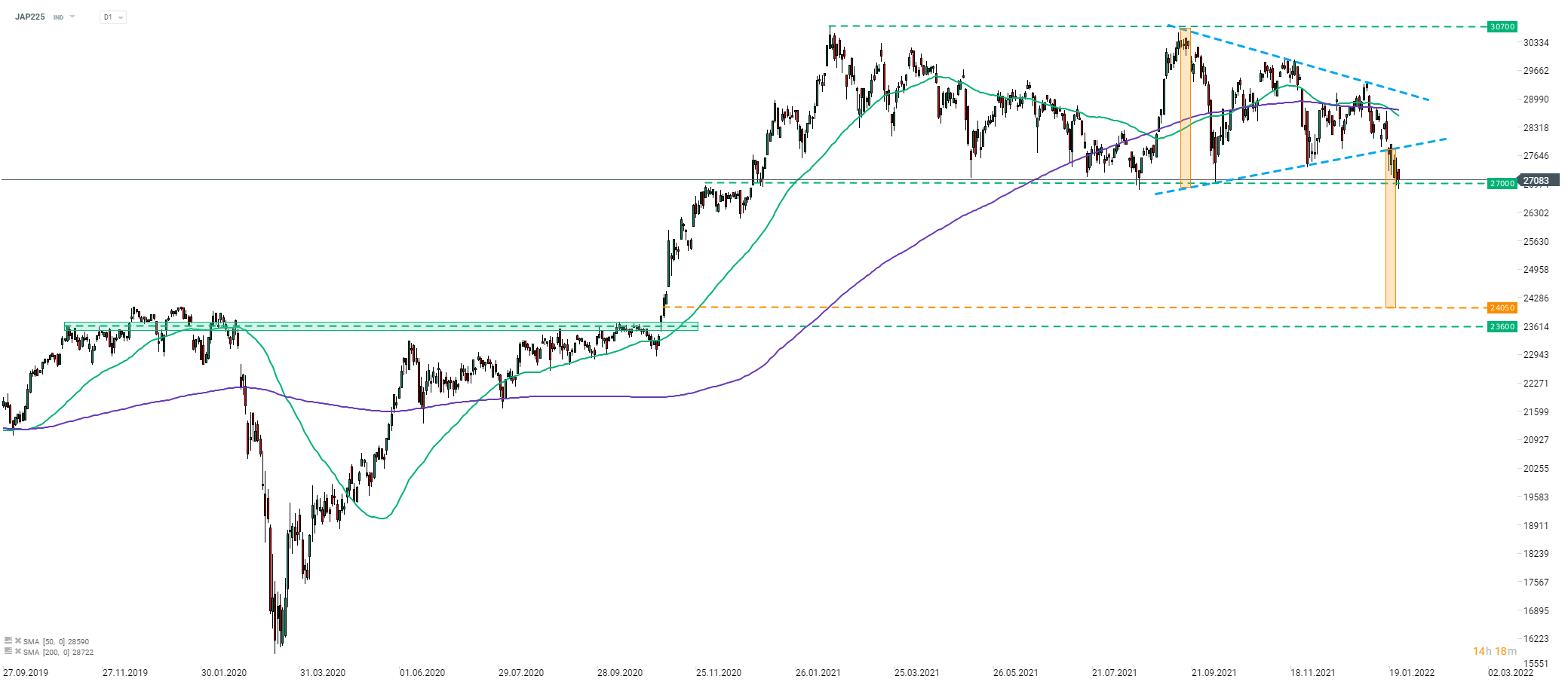Analisando o gráfico do Nikkei (JAP225) através do gráfico diário, podemos ver que o índice continua a ser negociado em baixa depois de ter quebrado abaixo do limite inferior do padrão gráfico. O índice atingiu hoje uma importante zona de suporte a curto prazo nos 27.000 pts, mas não conseguiu quebrar abaixo dessa zona.