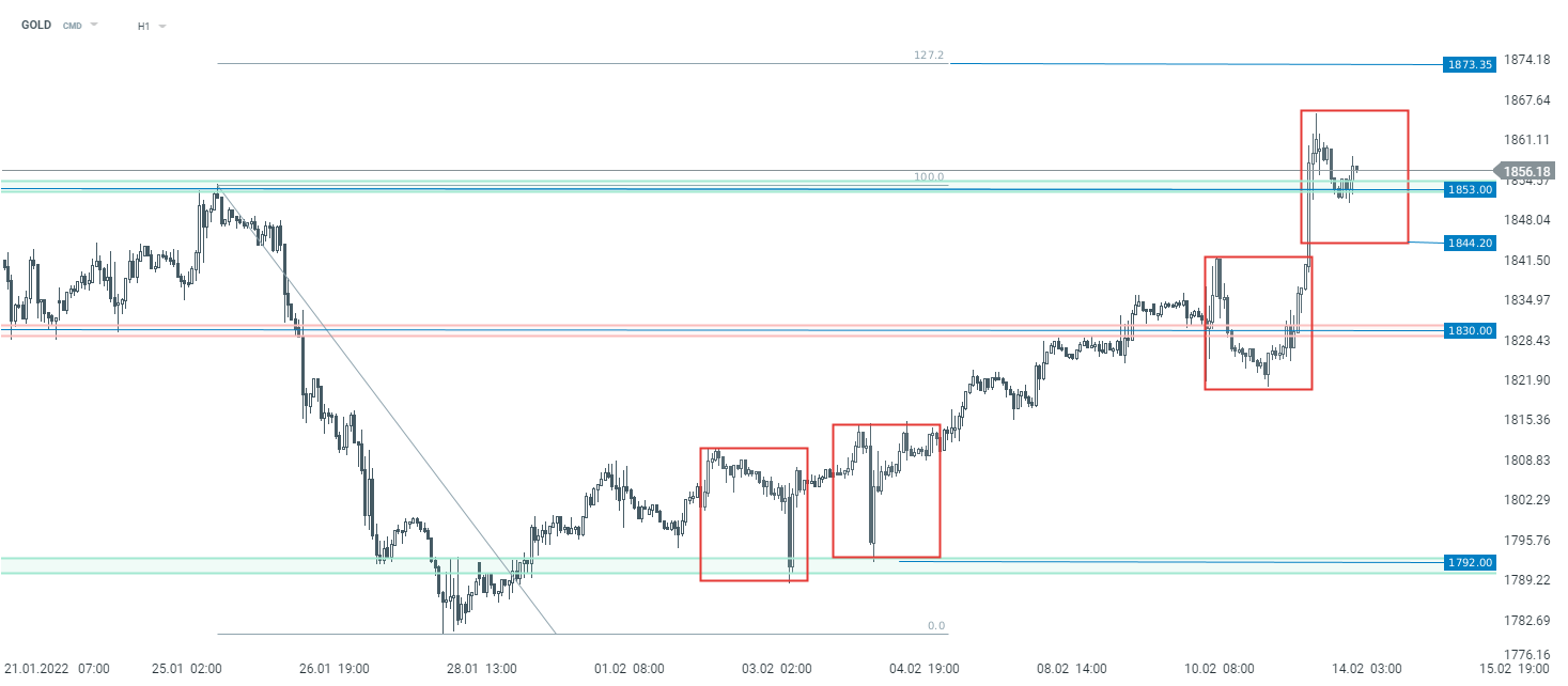 Analisando o gráfico do OURO através do período de tempo de H1 verificamos que o metal precioso registou fortes ganhos no final da sessão de sexta-feira, quando foi noticiado que a invasão da Ucrânia poderia ocorrer logo esta semana. O preço do ouro posicionou-se acima dos $1.850. Contudo, neste momento verificamos que o preço está a corrigir e a testar a zona de suporte perto dos 1.853 dólares. Se os compradores recuperarem o controlo do preço junto desta zona, não se pode ser excluída a possibilidade de um novo movimento de alta. Por outro lado, se o preço continuar a descer e quebrar abaixo da marca dos 1.853 dólares, a próxima zona de suporte marcada pelos 1.844 dólares pode estar em risco.
