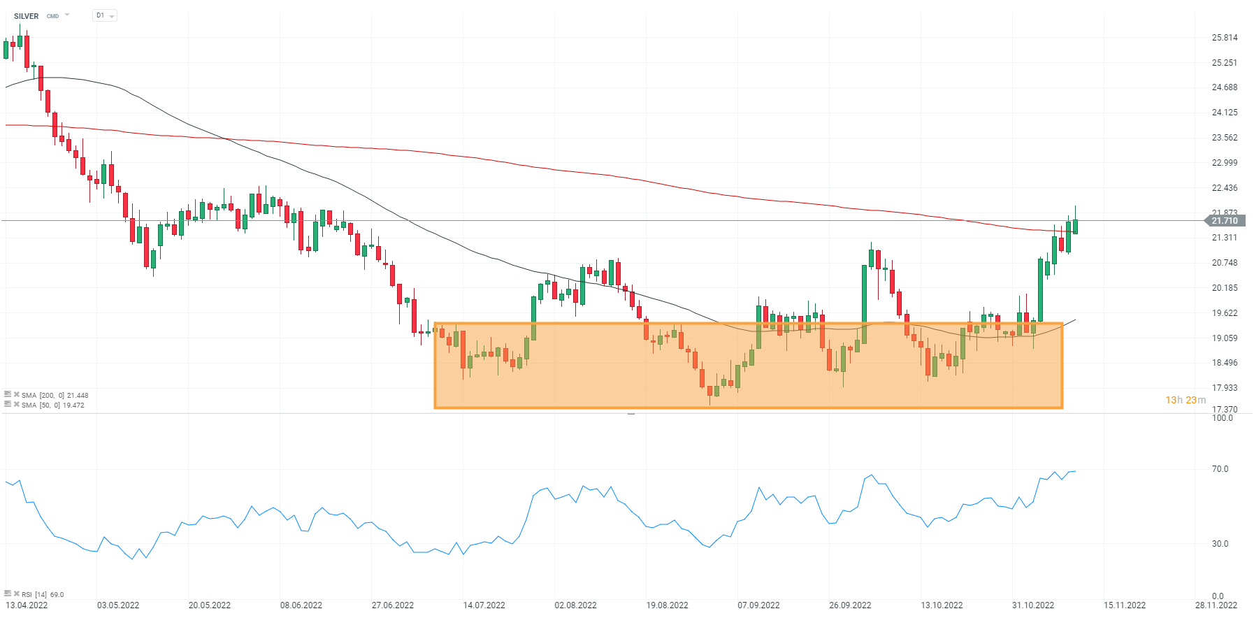 Uma queda maior do que a esperada nas expectativas de inflação poderia reforçar as posições de alta em antecipação de um pivot da Reserva Federal e um arrefecimento do sentimento agressivo e falcatrua da Reserva Federal. De facto, é provável que a Reserva Federal se incline para caminhadas mais baixas em reuniões futuras. Em tal situação, o cenário base parece ser um enfraquecimento do dólar e um reforço dos índices e metais preciosos, onde o capital até agora "à espera de oportunidades" no porto seguro em que o dólar americano pode fluir. Olhando para o gráfico SILVER no intervalo D1, podemos ver que o preço da prata ganhou dinamicamente nos últimos dias, saltando quase 20% dos mínimos anuais perto dos $18. O apoio chave pode ser encontrado na área de $17,5 por onça. Este apoio é estabelecido por reacções de preços anteriores. A procura reagiu três vezes a quedas na área de 18 dólares e cada vez impediu que o preço do lingote caísse mais fundo, formando uma formação em alta que se assemelhava a um triplo fundo. Significativamente, o preço SILVER rompeu a resistência sob a forma da média móvel de 200 sessões (vermelho), o que indica uma possível mudança na tendência. Note-se que a média móvel de 50 períodos (preto) está a começar a enrolar-se para cima em direcção à média de 200 períodos. Se a dinâmica ascendente for recebida, e as médias se cruzarem - podemos esperar uma chamada "cruz dourada" no gráfico SILVER, que pode ser percebida como uma espécie de "confirmação" da mudança de tendência.