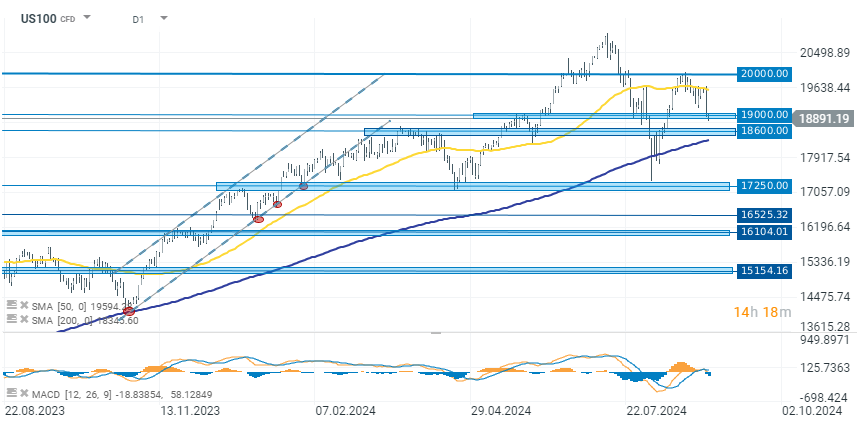 Os investidores reagiram não só aos dados decepcionantes dos EUA, mas também às preocupações com o entusiasmo geral em torno da IA. O US100 (índice Nasdaq 100) caiu 3,80% e as acções de chips sofreram um impacto significativo a nível mundial. Com o mês de setembro a ser historicamente difícil para as acções, os investidores estão a tornar-se cautelosos antes dos principais relatórios do mercado de trabalho no final desta semana. A confluência de factores, incluindo as elevadas valorizações no sector tecnológico e as preocupações com a recessão económica, contribuiu para a pressão.