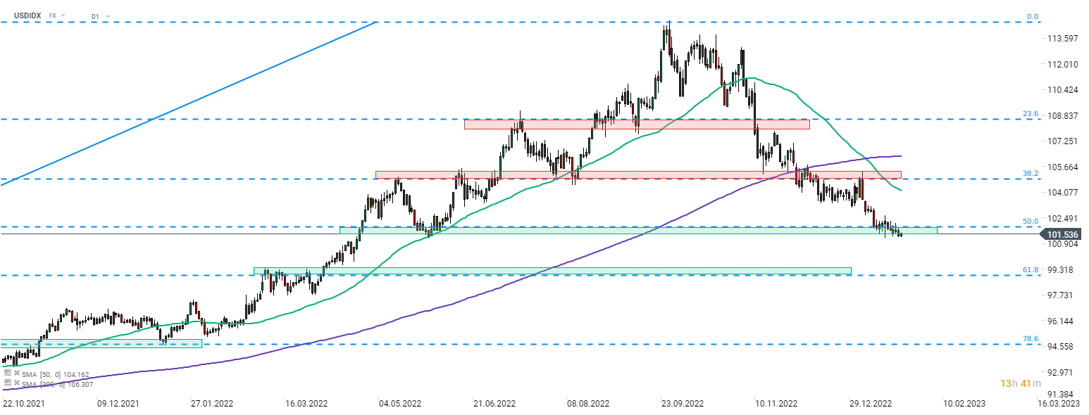 Ao analisarmos o índice do dólar americano (USDIDX) no intervalo D1, podemos ver que o dólar tem vindo a recuar há bastante tempo. O índice está actualmente a testar a zona de suporte nos 101,50 que coincide com os níveis de Fibonacci nos 50%.