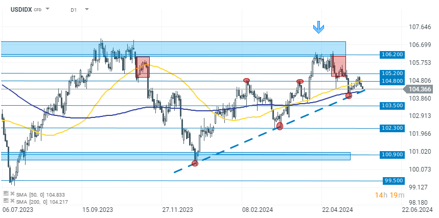 As descidas do USDIDX começaram após a decisão do FOMC no final de abril (retângulo vermelho no gráfico). No entanto, após várias semanas de uma tendência descendente, o índice do dólar está agora a testar uma importante zona técnica marcada pela linha de tendência de alta. O fator decisivo pode ser o relatório do PIB do 1º trimestre de 2024 na quinta-feira e o relatório do PCE na sexta-feira. Ainda assim, se a linha de apoio for quebrada, podemos esperar um movimento em direção a 104,0000 pontos ou mesmo 103,5000 pontos.