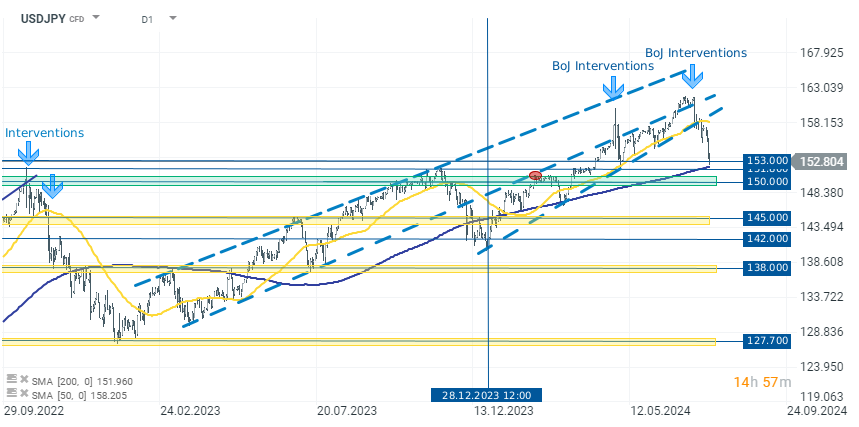 A mudança na tendência ocorreu após a intervenção do Banco do Japão no mercado cambial na primeira metade do mês, por volta de 10-12 de julho. O sell-off foi acelerado pelos dados mais baixos do IPC dos EUA, o que levou a uma forte desvalorização do dólar.