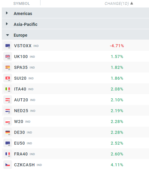 Fortes ganhos podem ser observados em todo o Velho Continente, enquanto que o índice de volatilidade, Euro Stoxx (VSTOXX, recua.. Fonte: xStation5