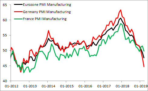Os PMIs preliminares para as duas principais economias saíram bem abaixo das expectativas, eliminado a possibilidade de uma melhoria económica neste trimestre e levanda a moeda única para baixo. O índice de manufatura alemão caiu para os 44,7 de 47,6 e atingiu o valor mais baixo desde meados de 2012 (crise do euro), enquanto que o índice de manufactura francês caiu dos 49,8 de 51,5. Os PMIs de serviços de ambos os países também cairam. Como resultado, o PMI de manufactura para a zona euro caiu para os 47,6 de 49,3 e o PMI de serviços caiu para 52,7 de 52,8. Os dados parecem confirmar a última ação do BCE para implementar um novo TLTRO.