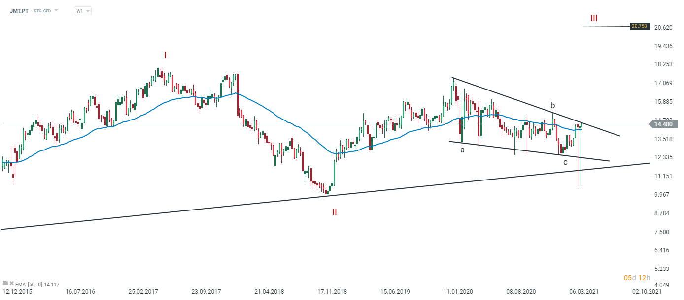 Ações da Jerónimo Martins (JMT.PT) a gráfico semanal. Fonte: xStation 5