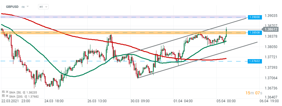 GBPUSD - a libra reagiu em alta junto da SMA 50 (linha verde) e quebrou acima da marca dos 1.3850 na sequência dos comentários de Boris Johnsons. Se o sentimento atual prevalecer, o movimento de alta pode ser prolongado em direção à marca dos 1,39. Fonte: xStation5