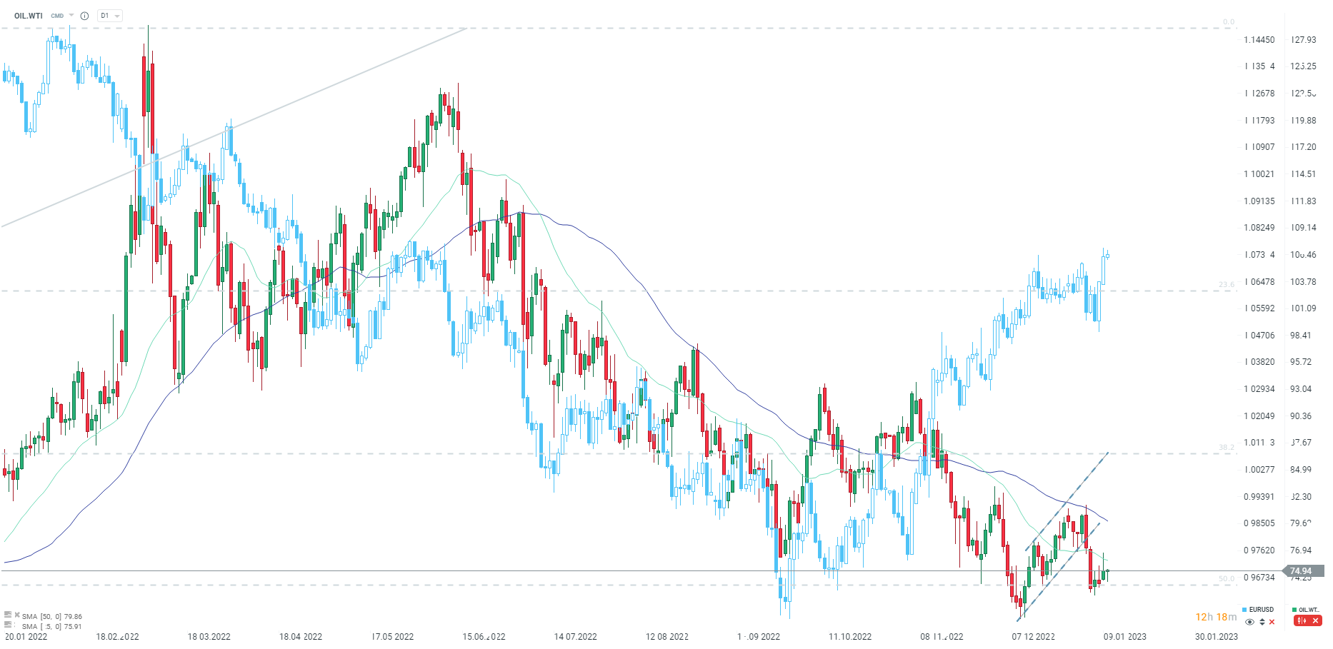 Os preços do petróleo permanecem a níveis baixos, mas é preciso lembrar que os Estados Unidos planeiam começar a aumentar as reservas estratégicas quando os preços descerem abaixo dos 70 dólares por barril. Ao mesmo tempo, o petróleo continua a divergir com o USD. Fonte: xStation5
