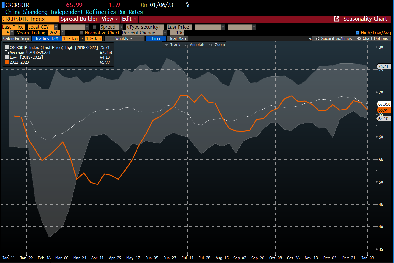 - Simultaneamente, as taxas de exploração nas refinarias chinesas da região de Shandong situam-se abaixo das médias históricas, o que significa que a procura de petróleo ainda não reagiu à reabertura da China