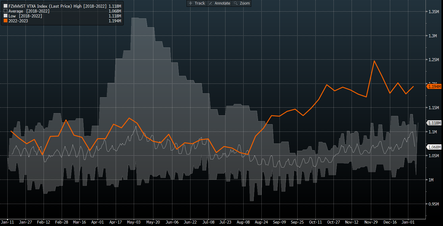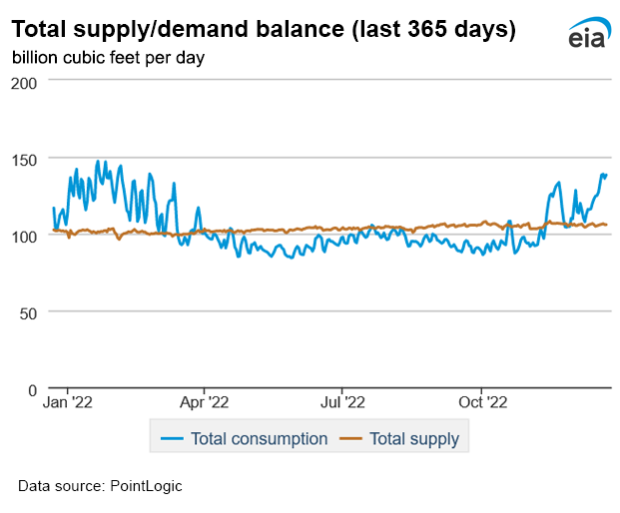 O equilíbrio entre a oferta e a procura mostra um aumento do consumo de gás na segunda a última semana de Dezembro de 2022. No entanto, é já uma história para os mercados e os preços são mais susceptíveis de reagir a novas previsões meteorológicas. Fonte: EIA