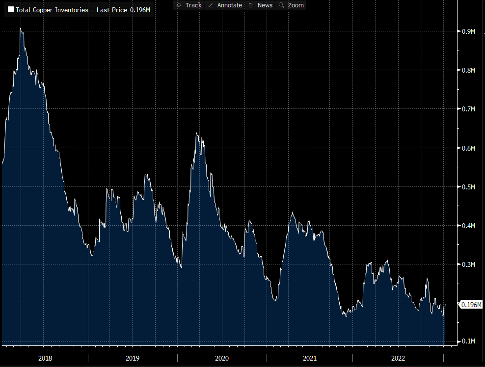 As reservas de cobre nas bolsas globais permanecem em níveis extremamente baixos. Fonte: Bloomberg