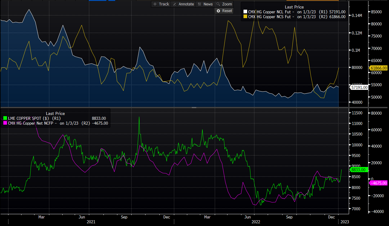 Uma série de posições curtas abertas sobre o cobre recuperaram significativamente na viragem de 2022 e 2023. A posição líquida permanece negativa. A recuperação do número de posições longas abertas nas próximas semanas poderá dar uma pista no início de uma nova tendência no mercado do cobre. Fonte: Bloomberg