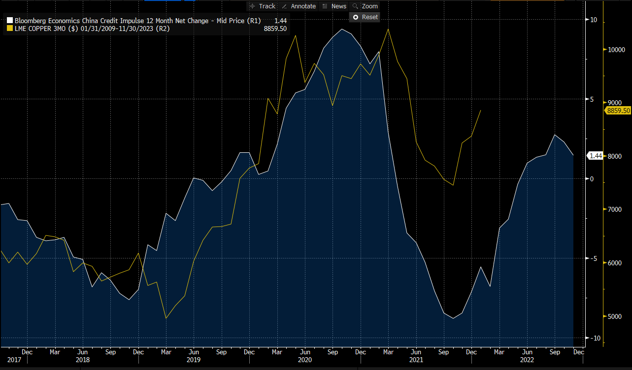 - Um impulso no crédito chinês pode apoiar a subida dos preços. No entanto, é de notar que afecta a economia com um atraso significativo