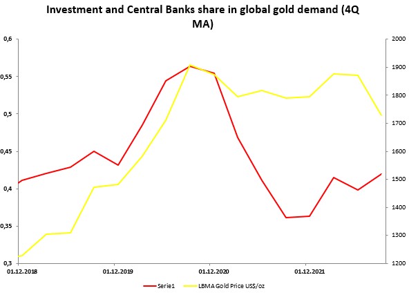 A parte do investimento e da procura do banco central na procura total de ouro está a aumentar. Dadas as compras significativas de ouro pelos bancos centrais no final do ano anterior, esta quota pode continuar a aumentar. Fonte: Bloomberg, XTB