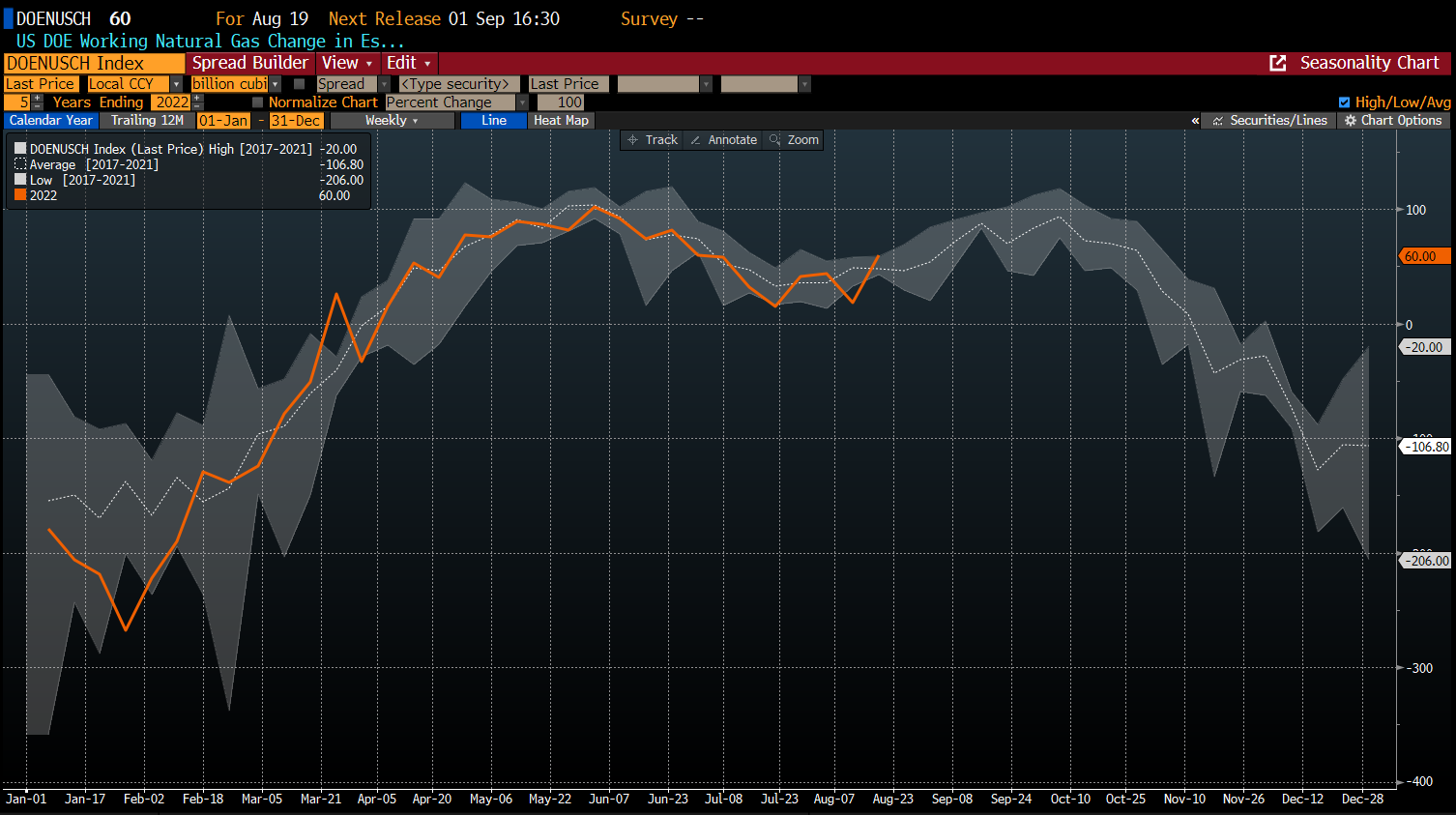 As reservas de gás natural dos EUA aumentaram 60 bcf na semana passada. Tal aumento foi possível, graças a uma menor procura interna. O terminal de GNL Freeport retomará as operações em meados de Novembro e, por conseguinte, as reservas deverão crescer mais até lá. No entanto, o consumo doméstico nos EUA continua a ser mais elevado do que o habitual. Fonte: Fonte: Freeport LNG: Bloomberg